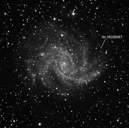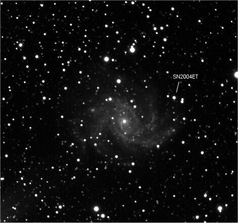 | The top image is from Skyhound showing the position of SN2004ET. The middle image above is one taken with New Mexico Skies iBisque on 10/12/2004 showing SN2004ET. The bottom picture is a Digital Sky Survey clearly showing that SN2004ET did not exist at the time the DSS image was taken. |
