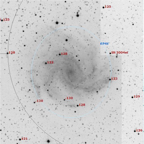 | Supernova 2004et Magnitude: 12.8 Position: R.A. = 20h35m25.4s, Dec. = +60o07'17.6" (2000) Reference: CBET 95 Discovery: September 27, by: S. Moretti NGC 6946 is an 9th magnitude, face-on spiral galaxy in Cygnus, very well placed for evening observation. Users of 6-inch or larger scopes under dark skies should be able to detect both the supernova and galaxy. This is the 8th supernova detected in NGC 6946. |