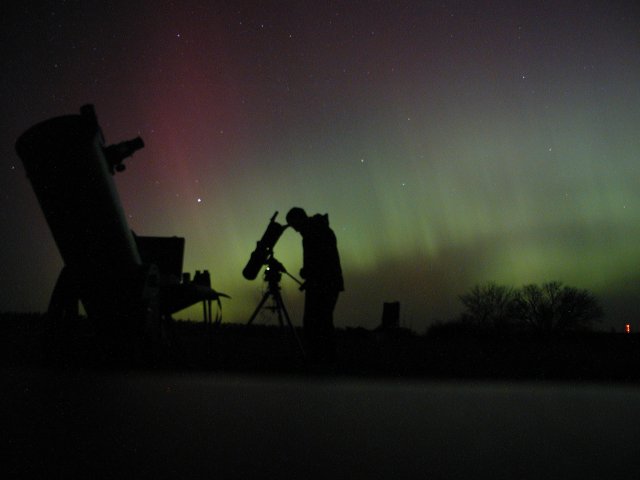 | This digital photo was taken under one of the most spectacular Auroras ever seen from Kansas. NCKAS member Patrick Rogers-Ostema is silhouetted against this incredible November 2004 display. This picture was taken at our Riley Dark Sky Site. Click here for an animated series of pictures. |