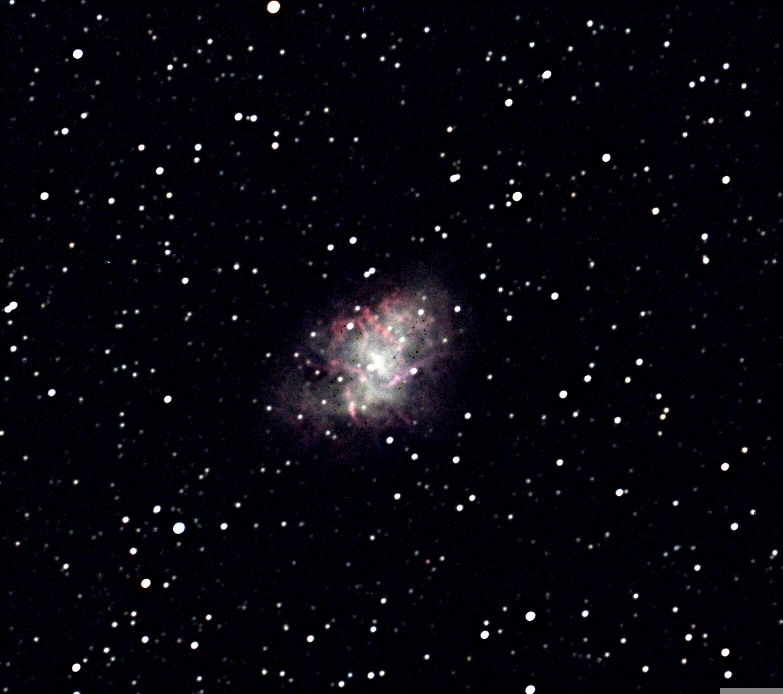 Crab Nebula, M1, NGC 1952 Other description: Nebula. Constellation: Tau Dreyer description: Very bright, very large, extended 135° +/-, very gradually little brighter middle, resolvable, but mottled; = M1. Magnitude: 8.4 RA: 05h 34m 44.3s Dec: +22°01'15" RA: 05h 34m 30.0s Dec: +22°01'00" (Epoch 2000) ***********Image Log************ 11-8-2010 = RGB 2 x 30 minute images with an ST-8300C through a TeleVue TV-102 working at f/6.9 |