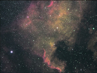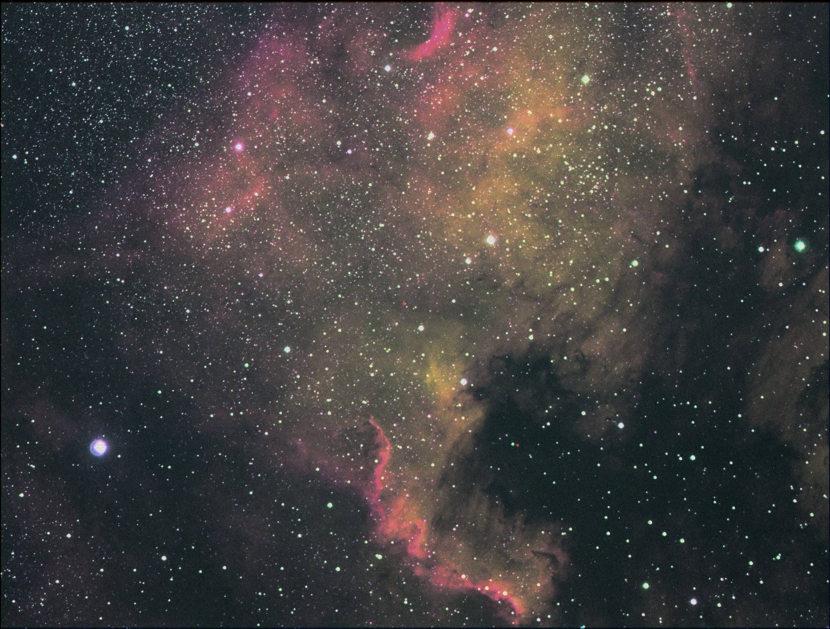 North American Nebula, NGC 7000 Other description: Nebula with dust. Constellation: Cyg Dreyer description: Faint, most extremely large, diffused nebulosity. RA: 20h 58m 55.6s Dec: +44°21'04" RA: 20h 58m 48.0s Dec: +44°20'00" (Epoch 2000) **** Observation Log 10/22/2003**** 11/92013 - Narrow band Hydrogen Alpha, Sulfur II and Oxygen III (HSO) image taken with an AT65Q, ST-8300M and Orion Nautilus Filterwheel on an Orion Atlas EQ mount. 10minute integration was used on this image. |