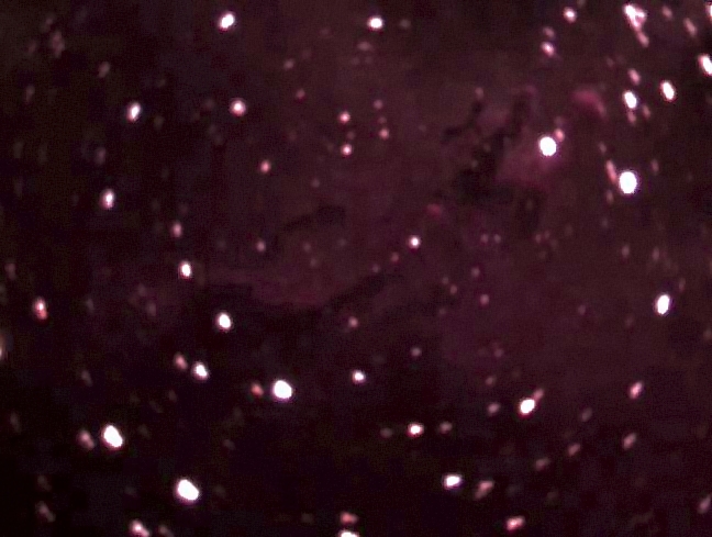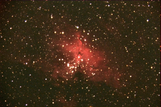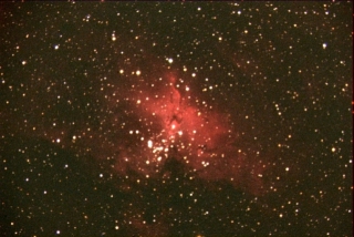 Nebula, M16, NGC 6611 Other description: Nebula with dust and cluster. Constellation: Ser Dreyer description: Cluster, at least 100 stars large & small; = M16. Magnitude: 6.0 RA: 18h 19m 04.1s Dec: -13°46'58" RA: 18h 18m 48.0s Dec: -13°47'00" (Epoch 2000) ***********Image Log************ This is a series of Meade DSI 25 second images on a alt-az mount! You can see the field rotation on the surrounding stars. Click on the image for a larger image. |
