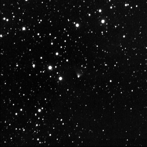 Gyulbudaghian's Nebula - At the heart of the Herbig-Haro object lies the variable Herbig AbBe pre-main sequence star PV Cep. This is a newly formed star that is surrounded by a rotating disk of material. At right angles to this disk are two jets of material, streaming away from the star at high speeds. We see the effects of one of these jets on the north side of PV Cep as the stream of material meets the surrounding gas in the interstellar medium. The jet to the south is obscured by a dark nebula (producing an absorption of over 3 magnitudes). RA: 20h 46m 18.7s Dec: +67°59'52" RA: 20h 46m 16.0s Dec: +67°58'38" (Epoch 2000) **** Image Log **** 10/15/2004 - The small jet-like object to the right of center. This is 2 X 180 second exposures aligned and combined. |