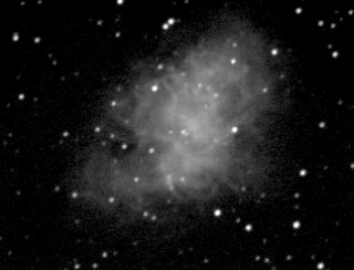 Crab Nebula, M1, NGC 1952 Other description: Nebula. Constellation: Tau Dreyer description: Very bright, very large, extended 135° +/-, very gradually little brighter middle, resolvable, but mottled; = M1. Magnitude: 8.4 RA: 05h 34m 44.3s Dec: +22°01'15" RA: 05h 34m 30.0s Dec: +22°01'00" (Epoch 2000) ***********Image Log************ 11/14/2003 - This image is with an ST-237A, 5 x 20 second Track and Accumulate images through a 16" SCT working @ f/3.95 |