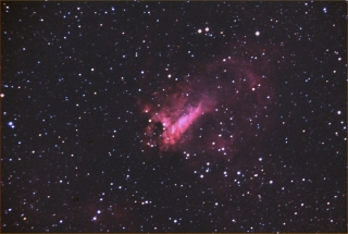 Nebula, M17, NGC 6618 Constellation: Sgr Dreyer description: A magnificent (or otherwise interesting) object!, bright, extremely large, extremely irregular figure, 2 hooked; = M17. Magnitude: 6.0 RA: 18h 21m 04.3s Dec: -16°10'58" RA: 18h 20m 48.0s Dec: -16°11'00" (Epoch 2000) **** Observation Log **** This image is a combination n RGB of 2 x 60 second Red, 2 X 60 second Green, 4 x 60 second Blue. This image was taken with a TeleVue 102 and ST-402ME. Click on the image for a larger version. |