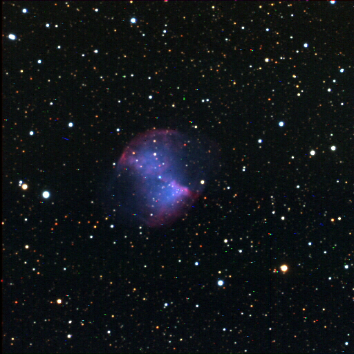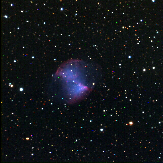 Dumbbell Nebula, M27, NGC 6853 Other description: Planetary nebula irregular. Constellation: Vul Dreyer description: A magnificent (or otherwise interesting) object!, very bright, very large, binuclear, irregular extended (Dumbbell); = M27. Magnitude: 8.1 RA: 19h 59m 47.9s Dec: +22°43'53" RA: 19h 59m 36.0s Dec: +22°43'00" (Epoch 2000) **** Image Log **** 10/15/2004 - This is a color composite totaling 600+ seconds RGB combined. |