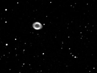 Ring Nebula in Lyra, M57, NGC 6720 Other description: Planetary nebula ring with central star. Constellation: Lyr Dreyer description: A magnificent (or otherwise interesting) object!, ring, bright, pretty large, considerably extended (in Lyra); = M57. Magnitude: 9.0 RA: 18h 53m 43.5s Dec: +33°02'27" RA: 18h 53m 36.0s Dec: +33°02'00" (Epoch 2000) ***********Image Log************ 10/12/2003 - This image is with an ST-237A, one 25 second exposure Binned at 1X1, through a 6" Newtonian reflector @ f/8. The mount is the Orion SkyView Pro. The central star is just visible. |