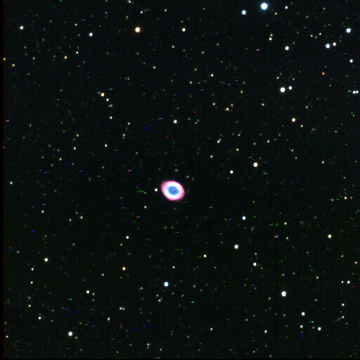 Ring Nebula in Lyra, M57, NGC 6720 Other description: Planetary nebula ring with central star. Constellation: Lyr Dreyer description: A magnificent (or otherwise interesting) object!, ring, bright, pretty large, considerably extended (in Lyra); = M57. Magnitude: 9.0 RA: 18h 53m 43.5s Dec: +33°02'27" RA: 18h 53m 36.0s Dec: +33°02'00" (Epoch 2000) ***********Image Log************ 10/15/2004 - This is a color composite totaling 600+ seconds RGB combined. No other processing. |