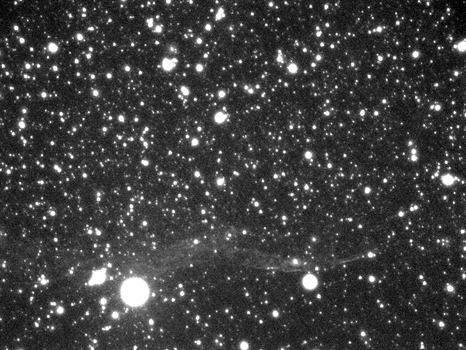 Veil Nebula, NGC 6960 Other description: Nebula. Constellation: Cyg Dreyer description: Very remarkable! Pretty bright, considerably large, extremely irregular figure, 52 Cyg involved. RA: 20h 45m 51.0s Dec: +30°43'58" RA: 20h 45m 42.0s Dec: +30°43'00" (Epoch 2000) ***********10/11/2003************ This is my first attempt at imaging nebula. This is the Veil Nebula or NGC6960, a Super-Nova Remnant. This is the ST-237A working @ f/3.5 through the Orion 3.9" 100mm refractor. This is a Track and Accumulate of 10 X 10 second images. You can just make out the nebula just to the right and above 52 Cygni, the brightest star in the image. The mount is the Orion SkyView Pro. Click on the image for a larger view. |